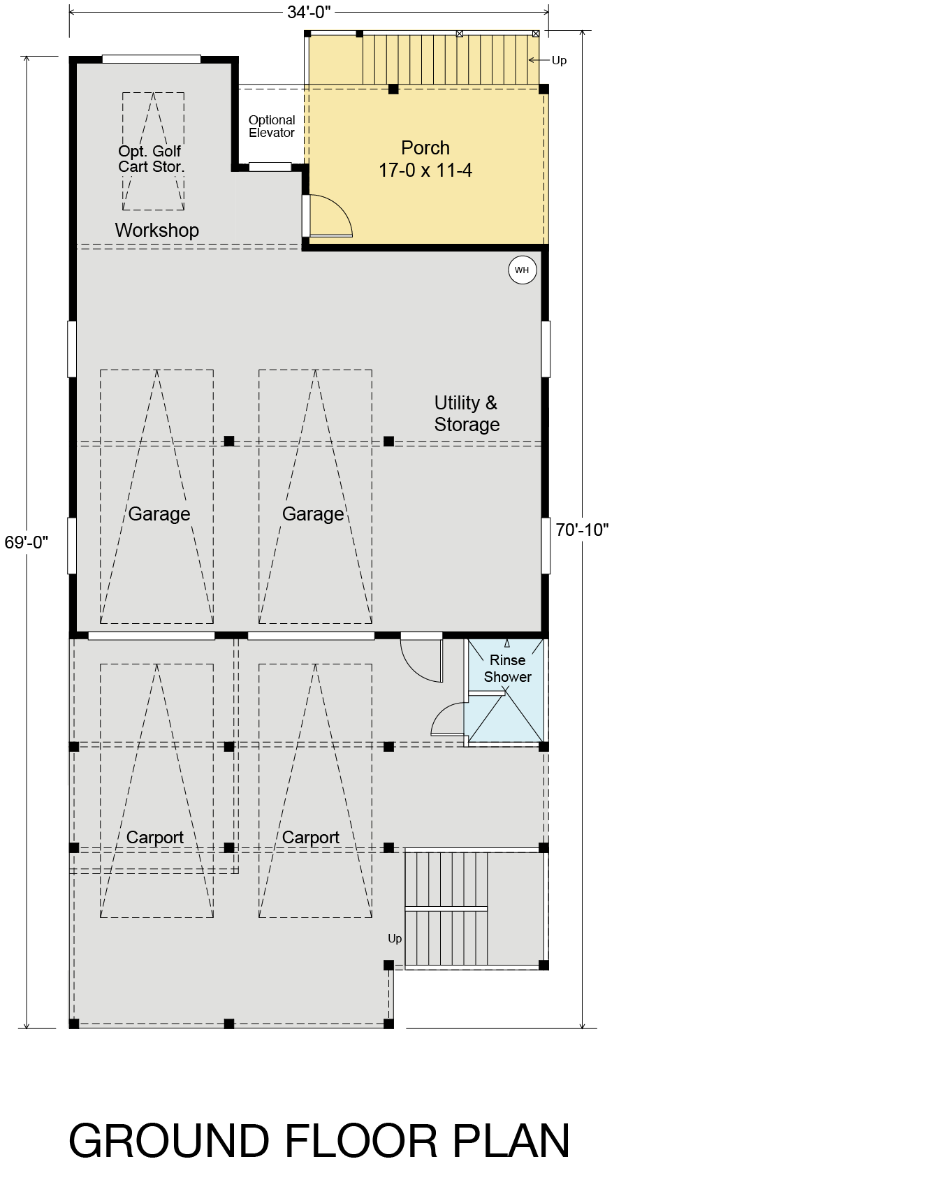 Ground Floor: The garage/covered carport offers parking space for up to four vehicles or a small boat. The outdoor rinse shower is a convenient addition, and the enclosed utility/storage/workshop within the garage provides ample storage space. There's also an option for golf cart storage at the back of the garage, along with a 17' x 11'-4" porch.