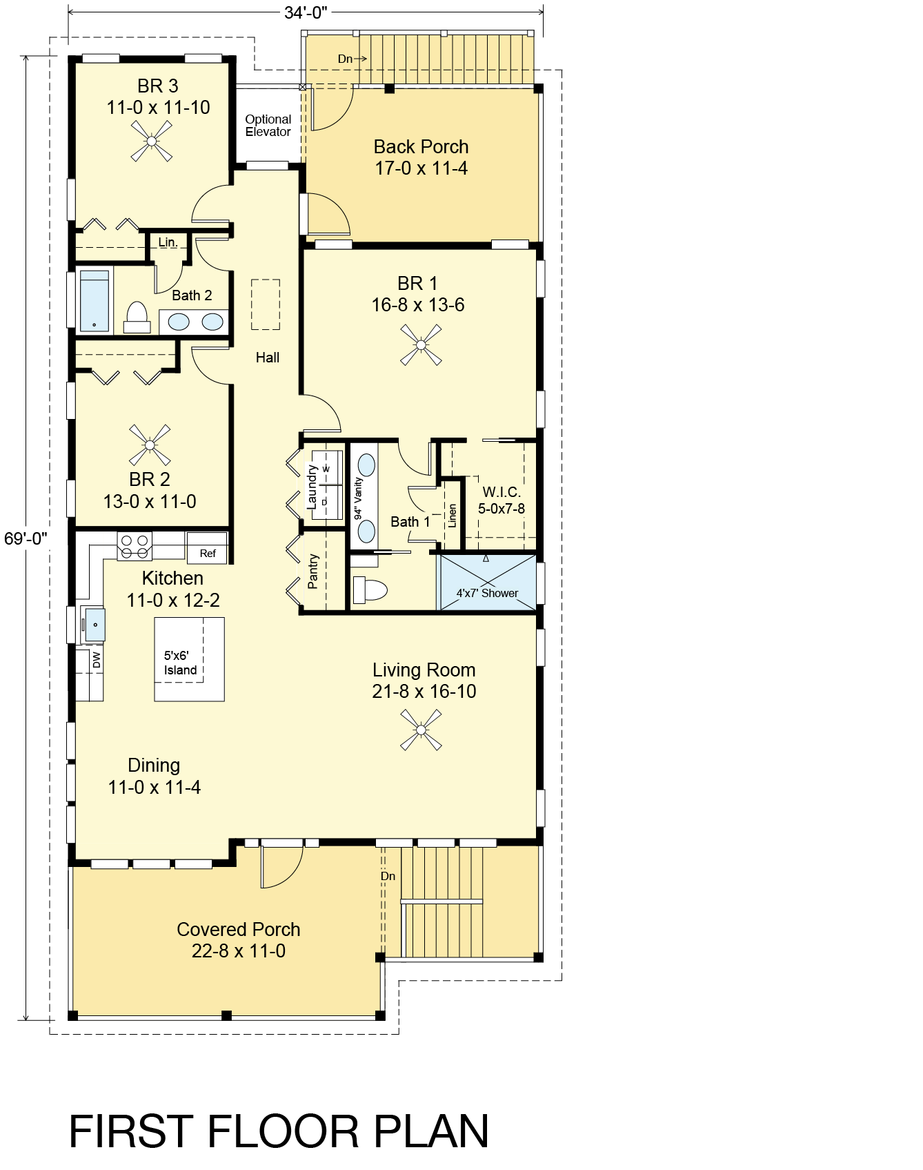 The Cutter 1674-3E house plan is designed to provide a comfortable living space of 1,674 square feet. It features three bedrooms, two baths, and the option to include an elevator for added convenience. The open great room seamlessly connects to the kitchen, which boasts a spacious 5'x6' island and a designated dining area. Additionally, the house includes covered front and rear porches, providing a perfect spot for outdoor relaxation.