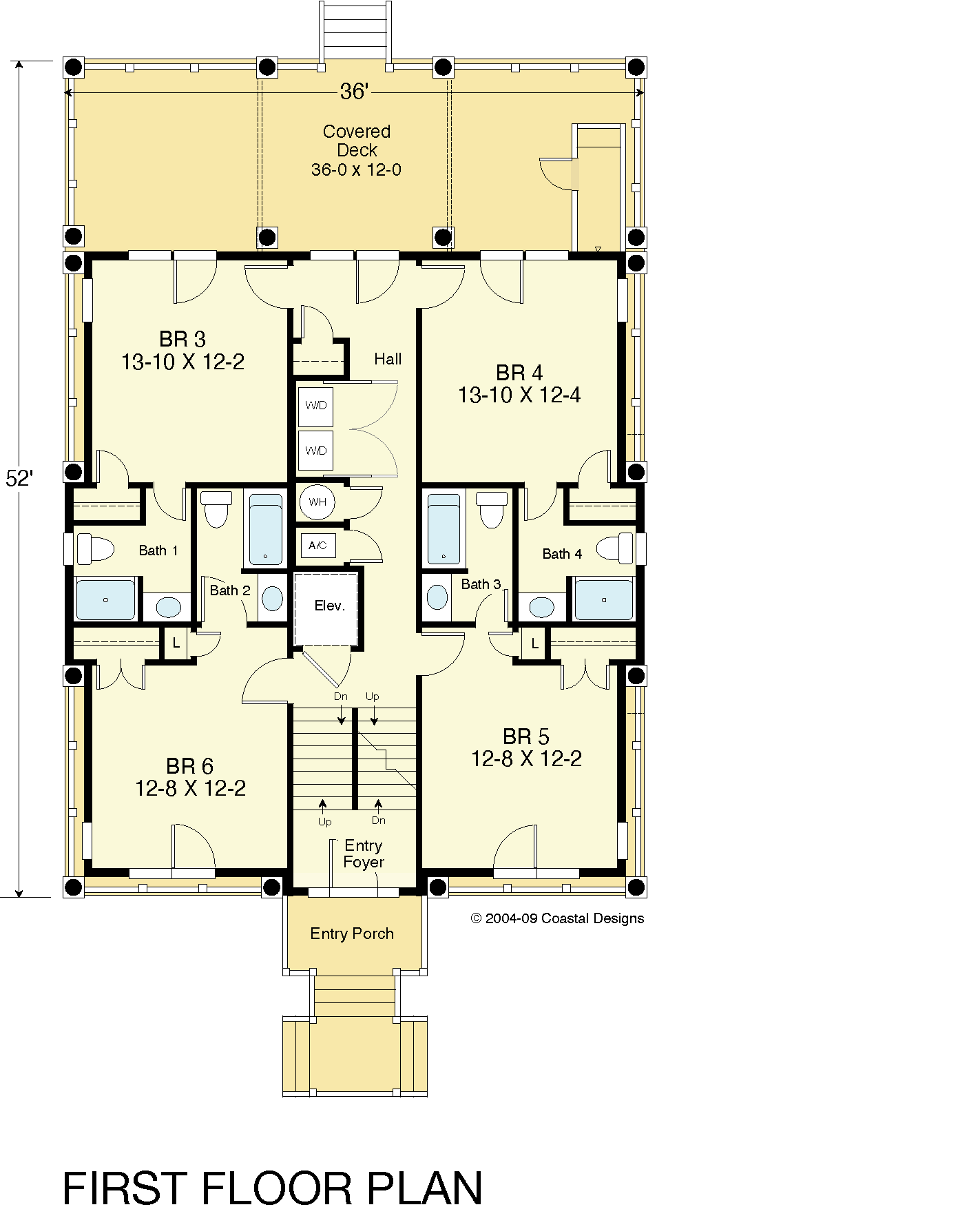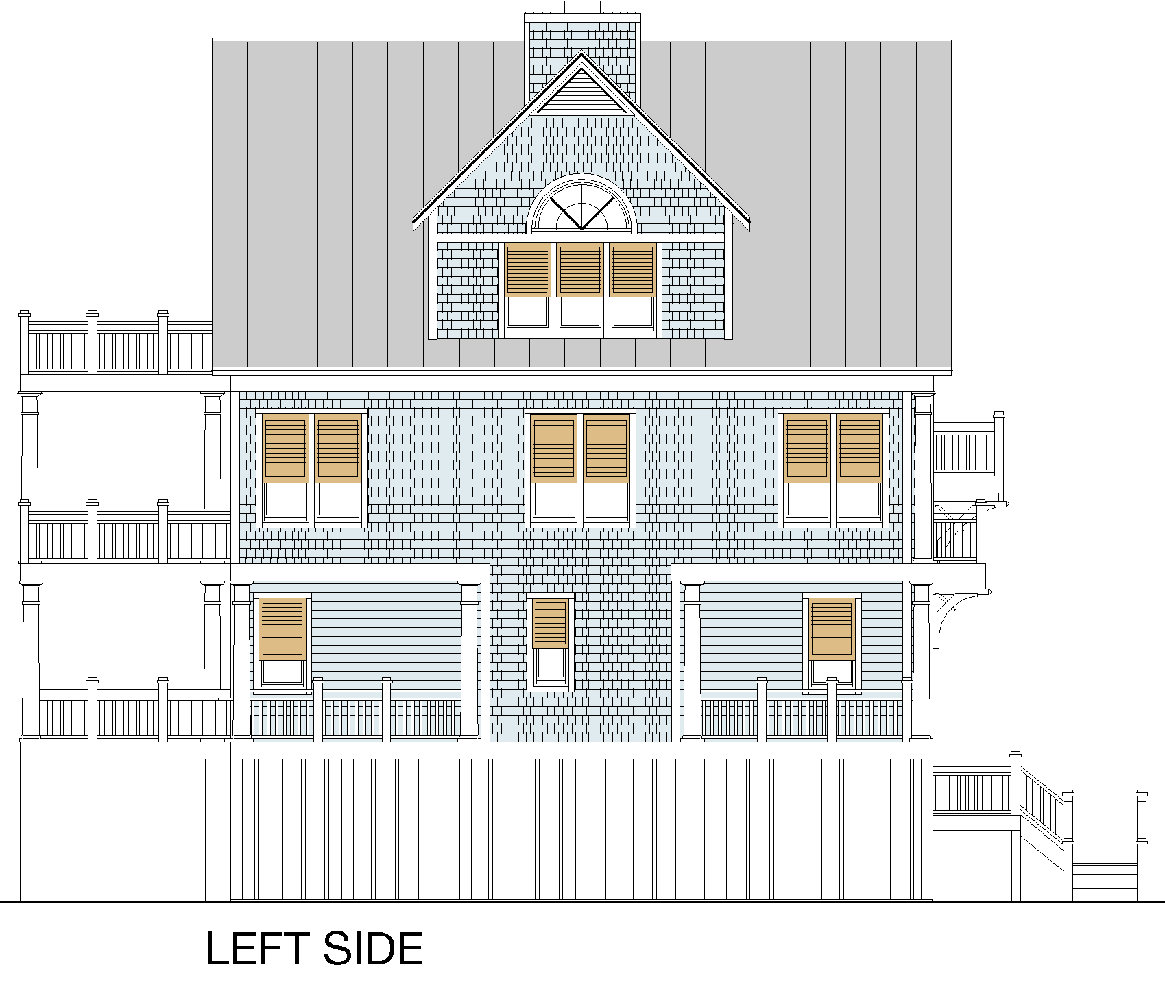 The Hampton 4157-6E is one of our 'over 2,000 sq. ft.' house plans with six bedrooms, six-and-half bathrooms, and an elevator. This plan has been very popular as a rental, with twin Main Suites on the top floor and great views. The very open Great Room, dining, and kitchen allow everyone to always stay with the action.