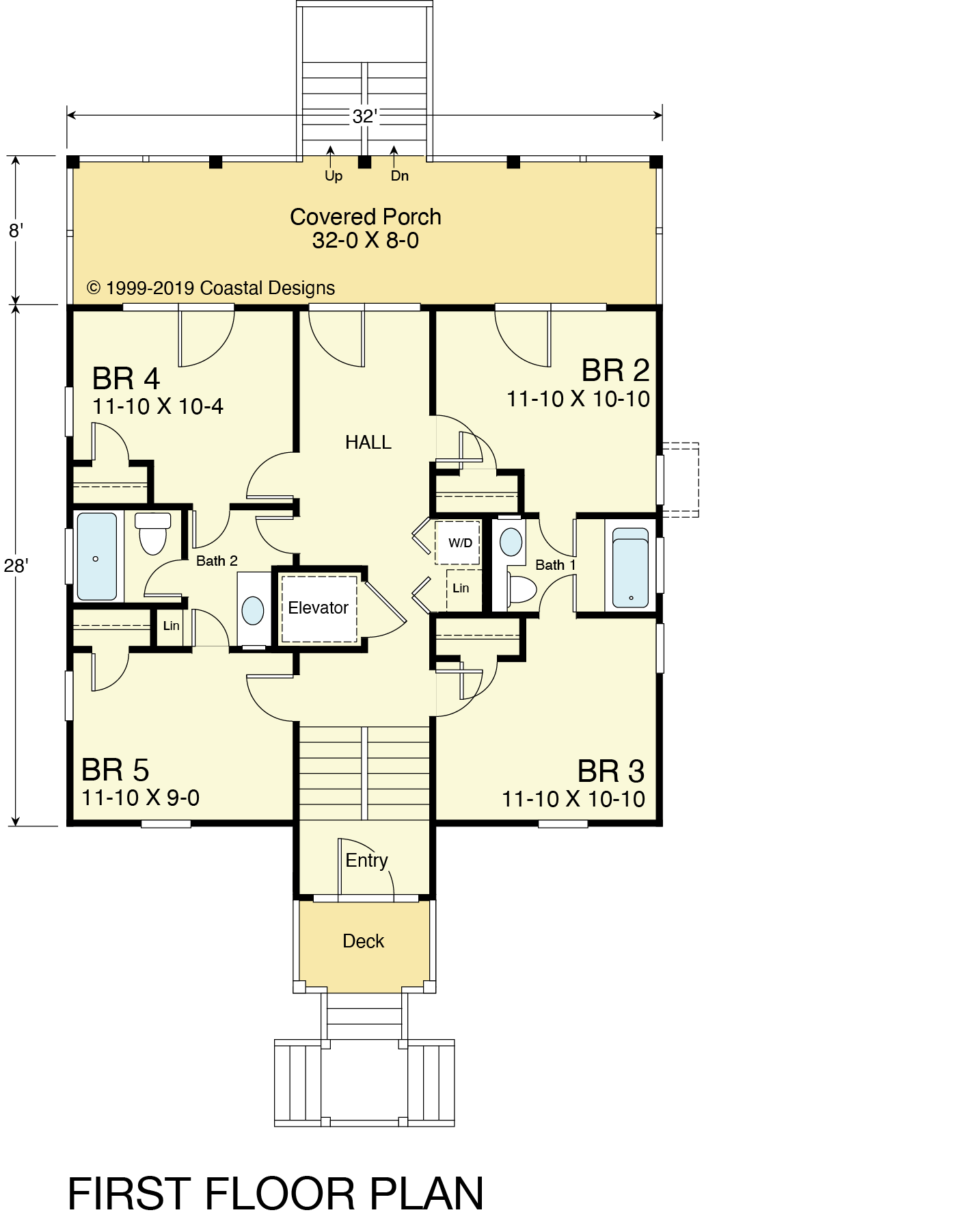 The Ocean Ridge 1853-5E beach house plan offers a spacious 1,853 sq. ft. of living space, including five bedrooms, three-and-a-half bathrooms, and the convenience of an elevator.