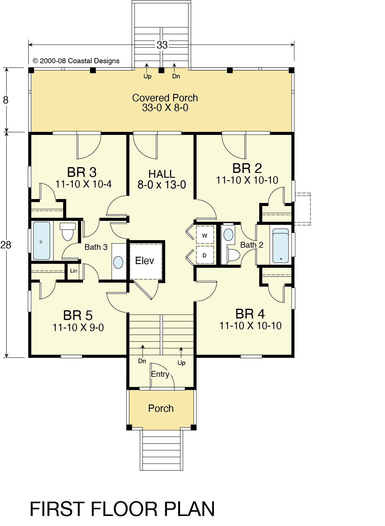 First Floor: The first floor of the Ocean Ridge 2001-5E beach house plan is designed with practicality in mind. It features charming porches, four bedrooms for family and guests, two shared bathrooms for convenience, and a designated area for a washer/dryer, ensuring ease of use and a comfortable living experience.