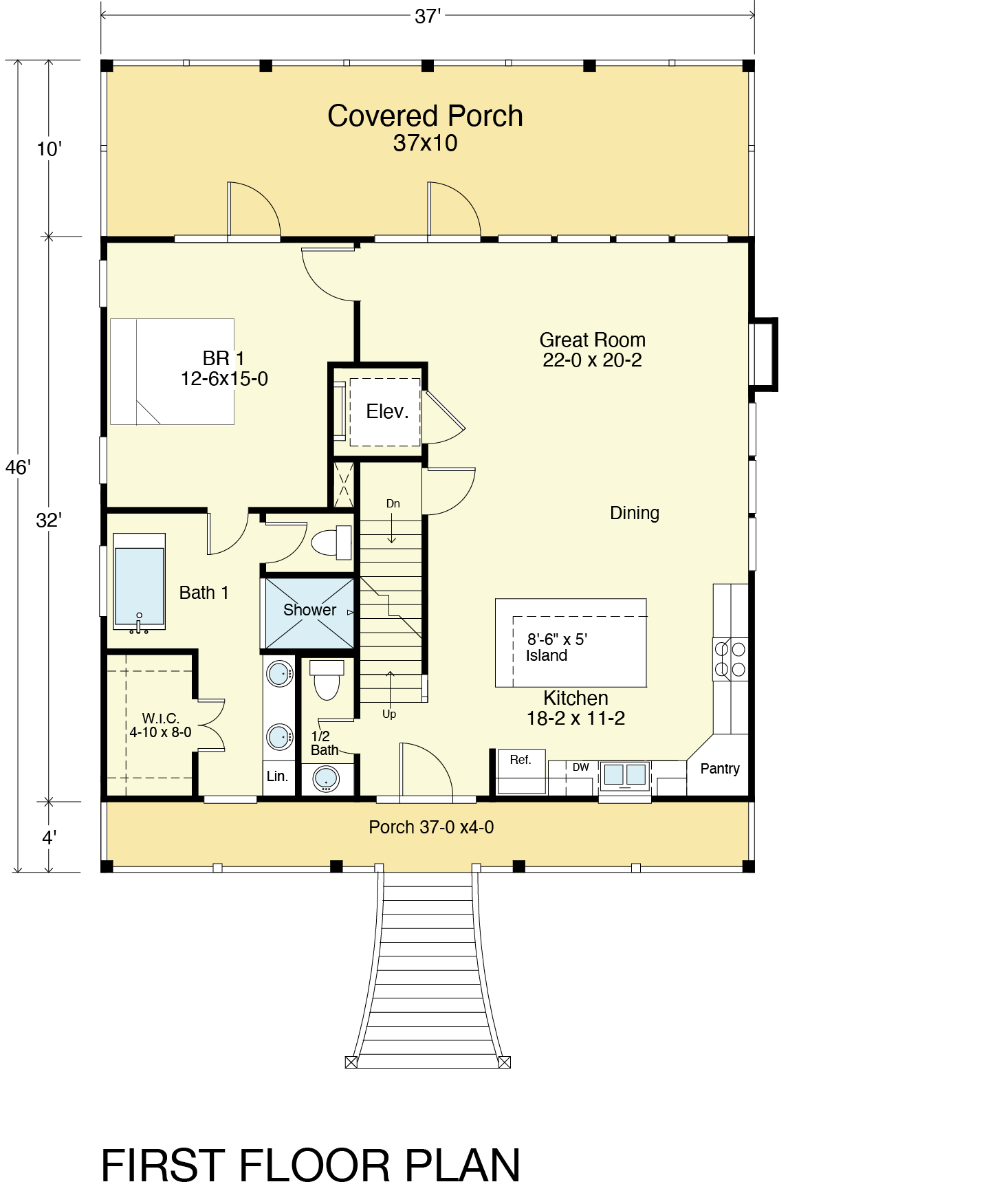 The inviting first floor boasts charming porches that offer a lovely outdoor space, a well-appointed kitchen with a large and functional island, an elegant dining area perfect for entertaining, a spacious great room ideal for relaxation, a convenient half bathroom for guests, and a serene bedroom with a luxurious en suite bathroom and a generously sized walk-in closet for all your storage needs.