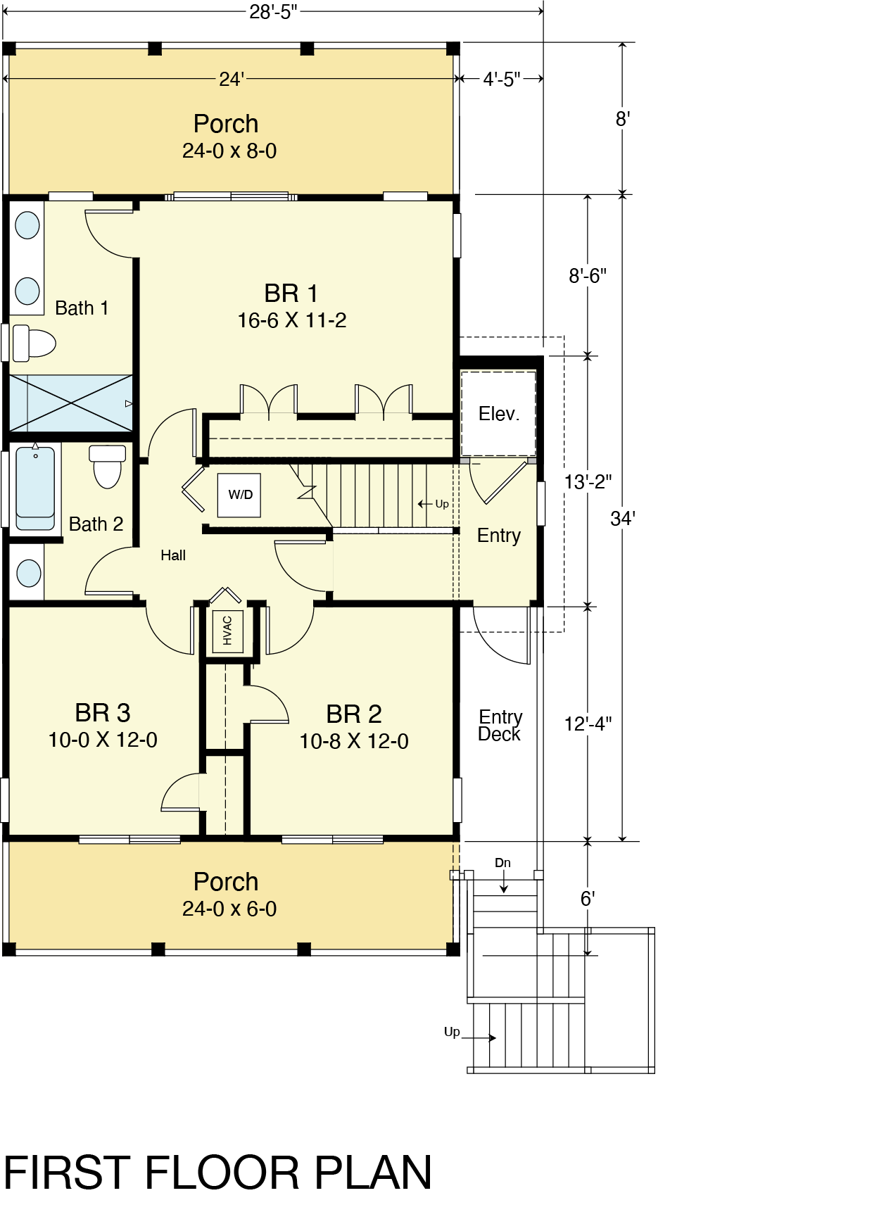 First Floor: Residents can enjoy porches, three bedrooms, two bathrooms, a designated area for a stack washer/dryer, an entry hall, and an entry deck.