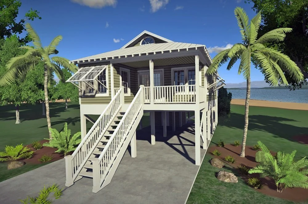 This small bungalow cottage was inspired by houses along the Carolina shores before the 1950s. The plan is best when outfitted with beaded V-groove pine paneling and louvered doors so the sea breezes can blow through and lull you to sleep at night. Bermuda shutters offer shade and protect the lovely cottage during coastal storms. Paddle fans and cathedral ceilings also help keep this cute cottage cool—a great house for those on a budget.