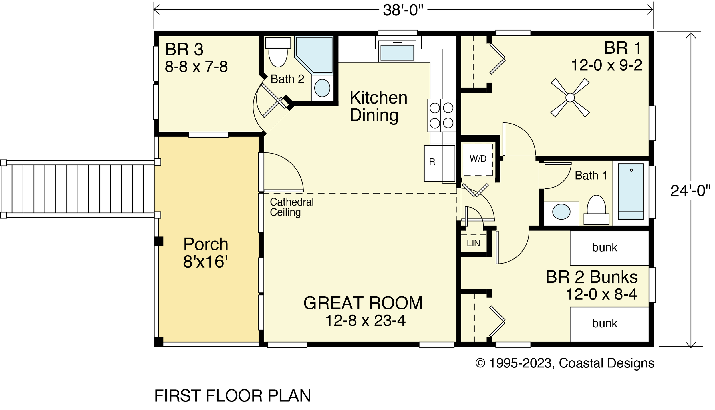 The Sea Gull 800-3 house plan is a one-level beach cottage, perfect for a weekend getaway. The great room, kitchen/dining area, three bedrooms, two full baths, and porch are all on the same floor. The ground floor provides storage for beach chairs and surfboards. This plan is designed for a narrow lot with pier construction.