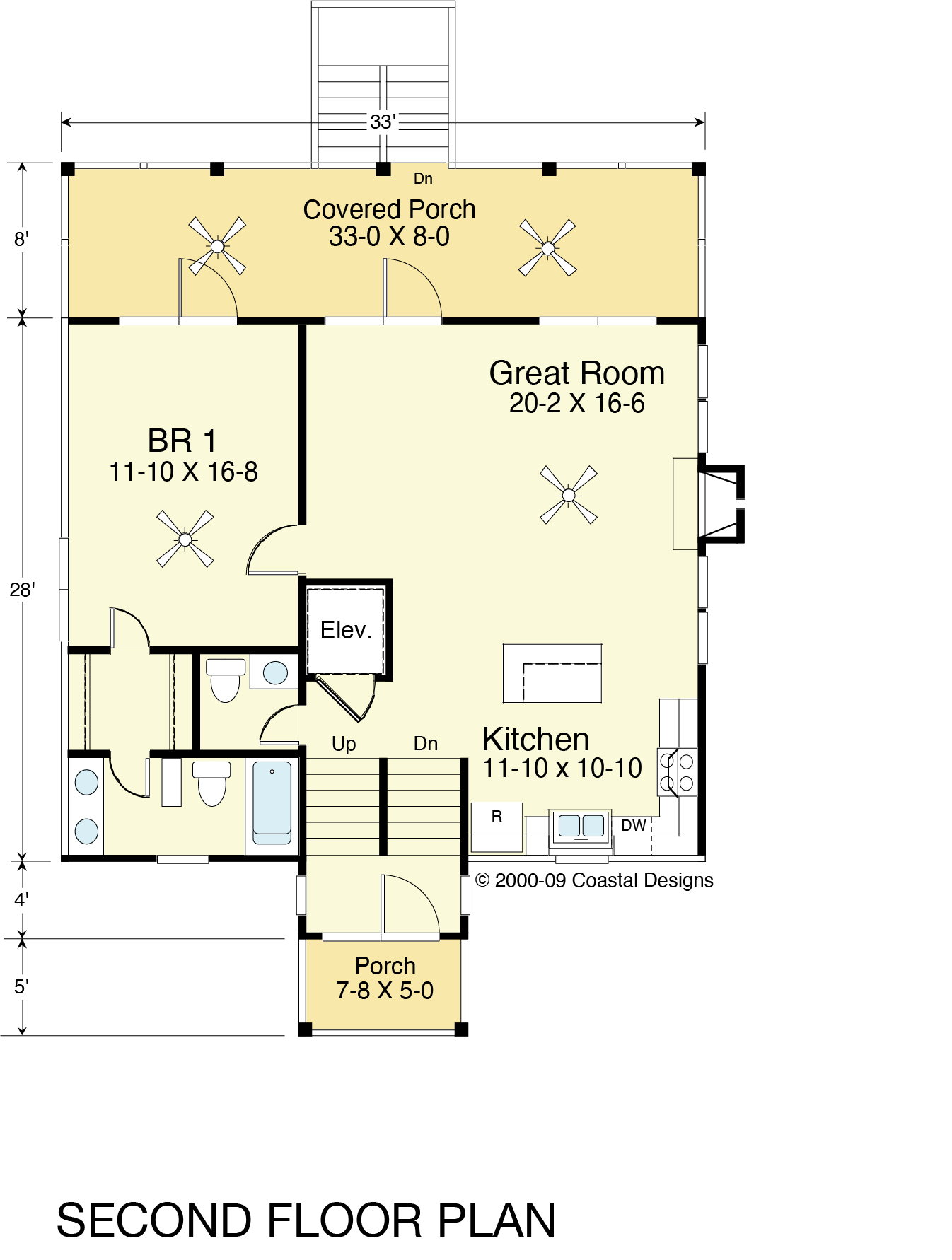 The Sea Oats 2145-5E beach house plan offers a generous 2,145 square feet of living space, carefully designed to accommodate five bedrooms, three-and-a-half bathrooms, and even an elevator for convenience.