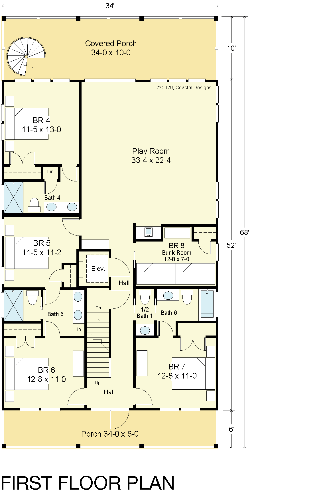 The Shell Island 4780-8E is one of our largest house plans, which is 34’-0” wide x 68’-0” deep x 40’-8” high with a 4,779.3 sq. ft. living area!