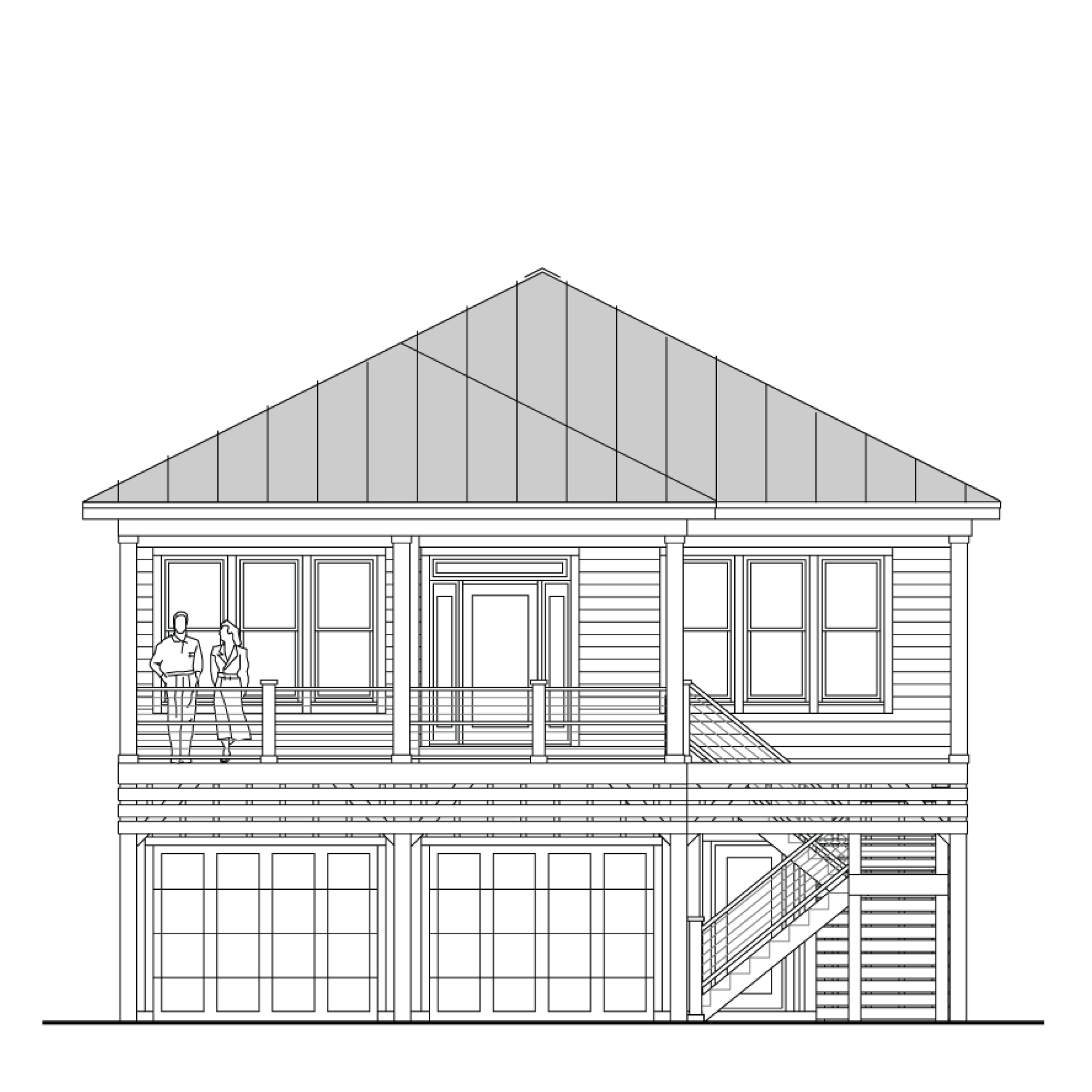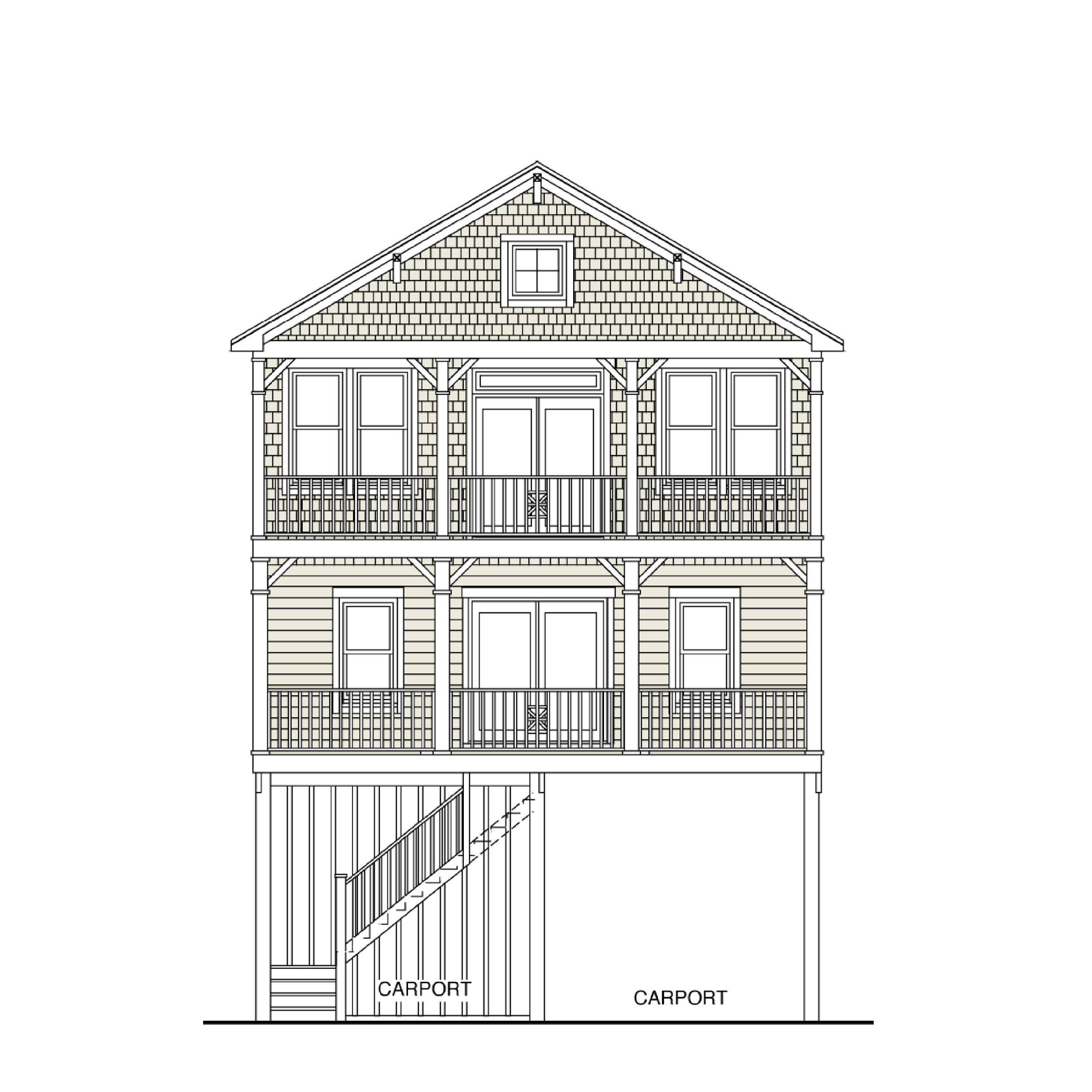 • Line drawing of a multi-story beach house on stilts, with exterior stairs on the right, multiple windows, balconies, and a gabled roof.
