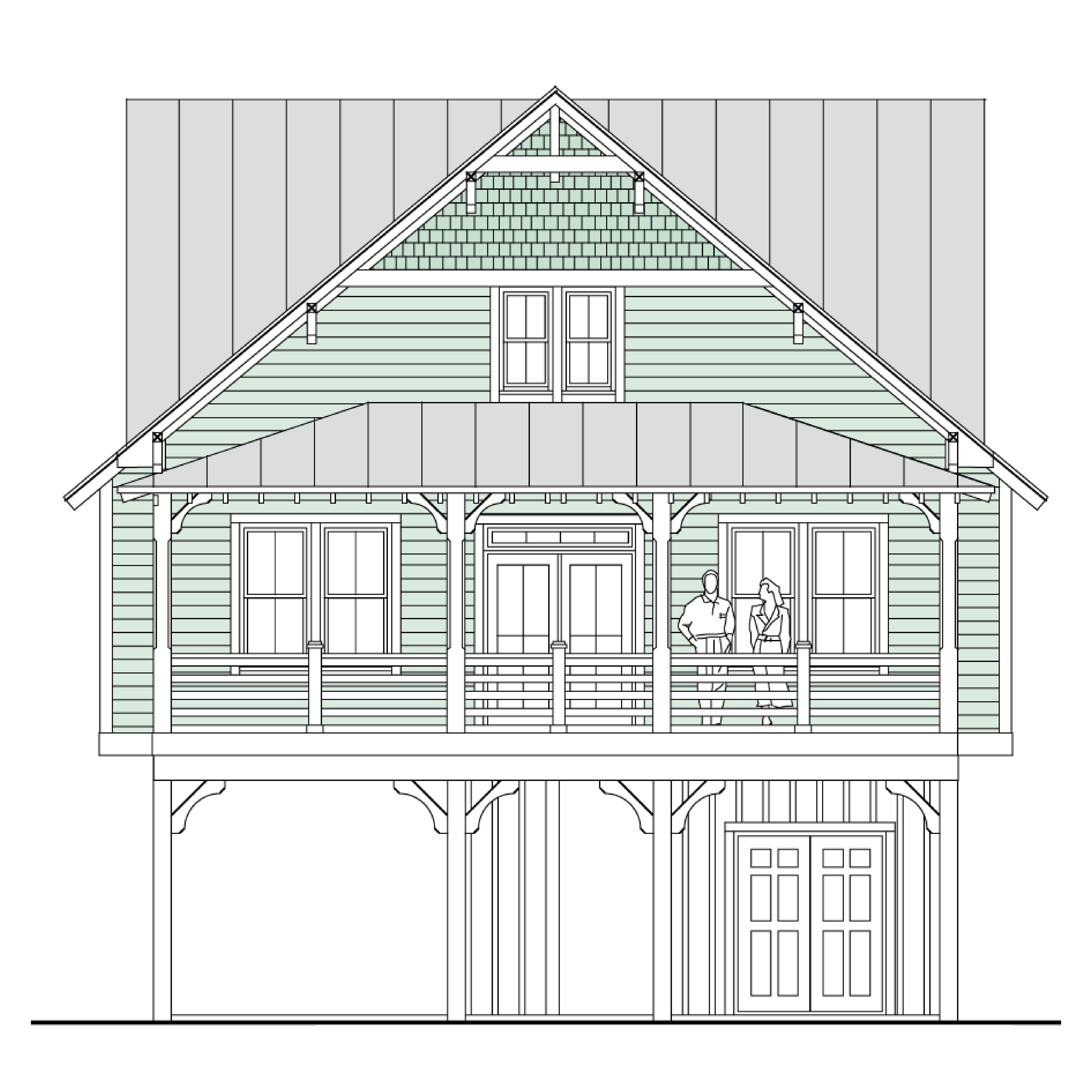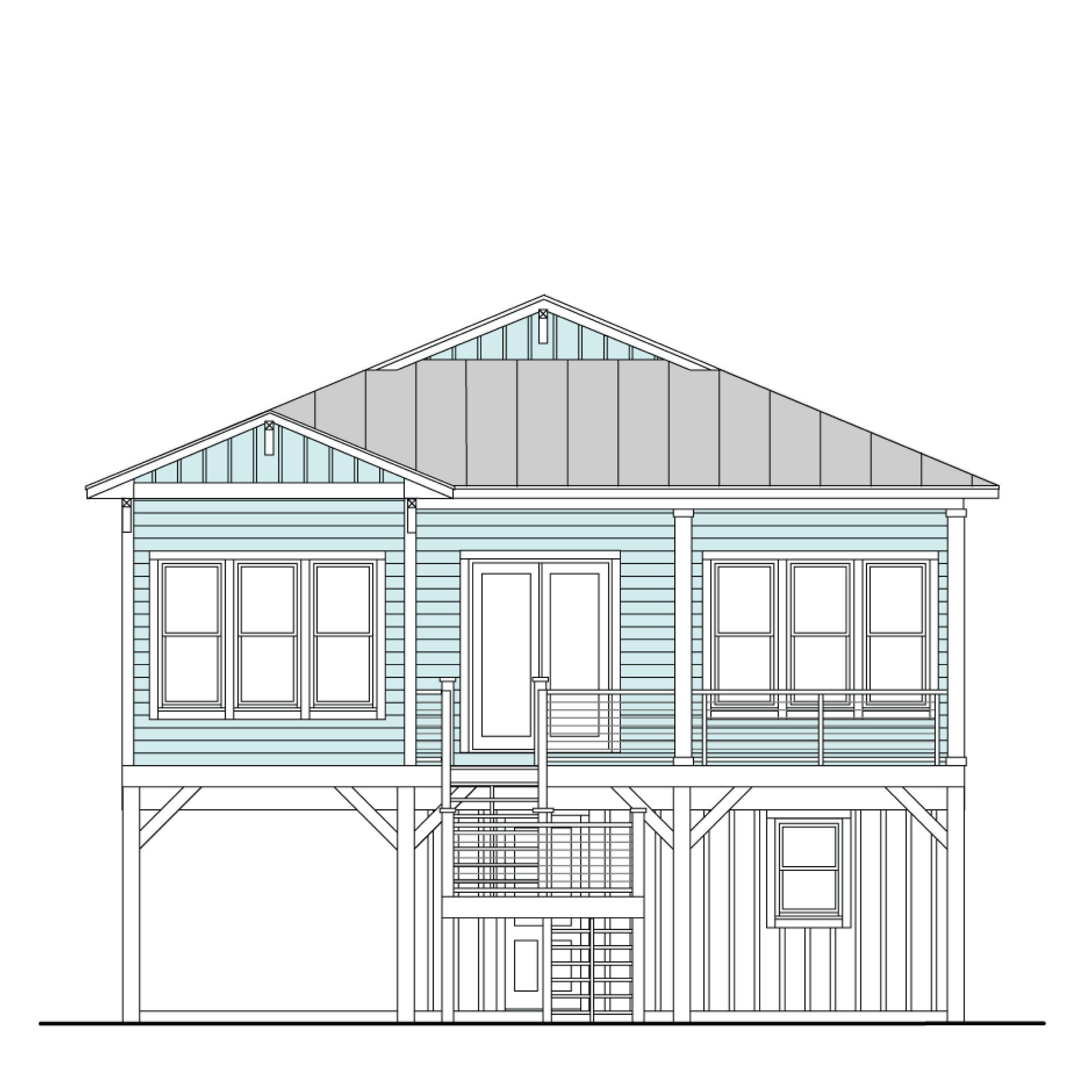 • Architectural drawing of a raised beach house with a balcony, two sets of double doors, three windows, a gable roof with a weather vane, and support beams underneath.