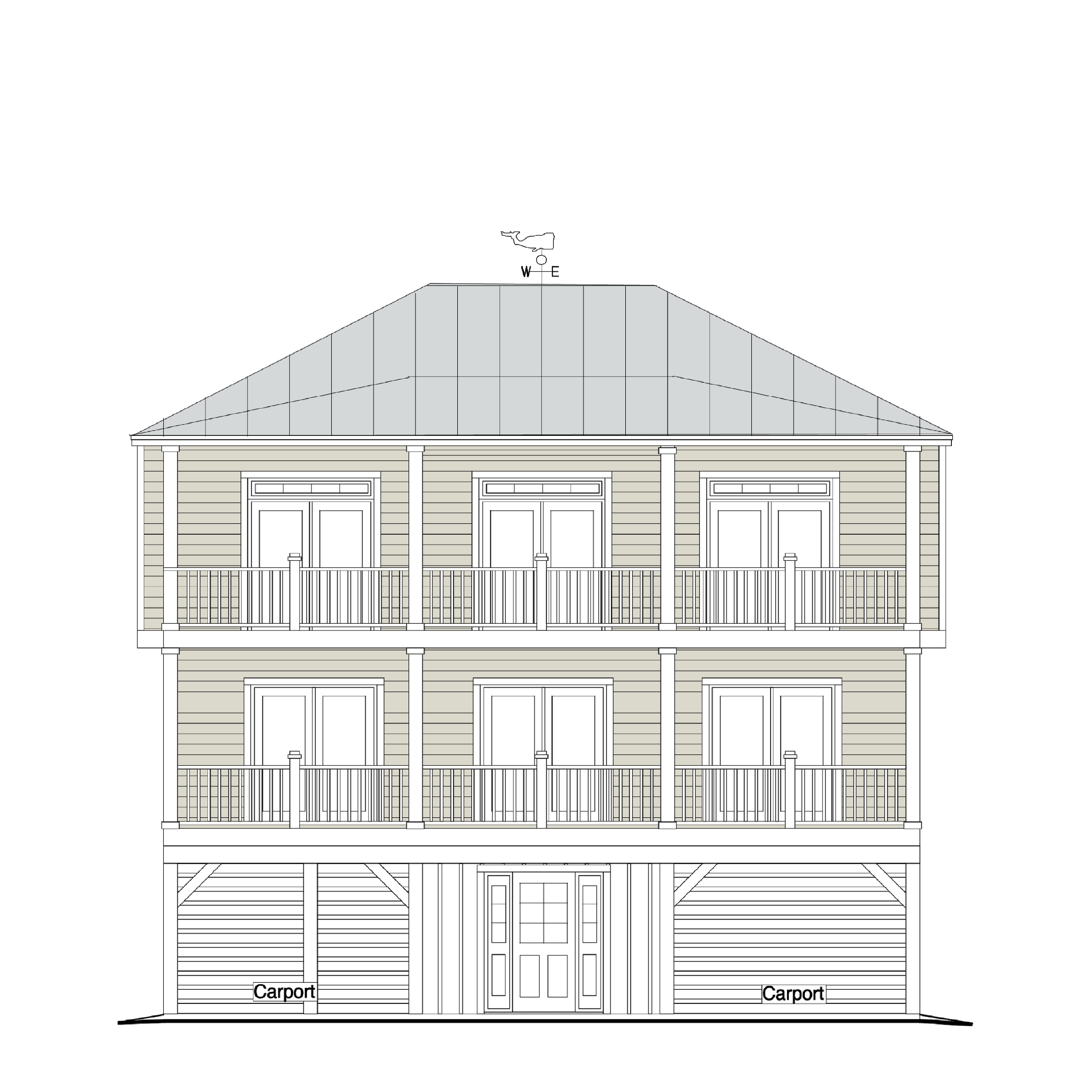• Line drawing of a three-story house with a front door, balconies on the second and third floors, and attached carports on the ground level. A weather vane with a whale is on the roof.