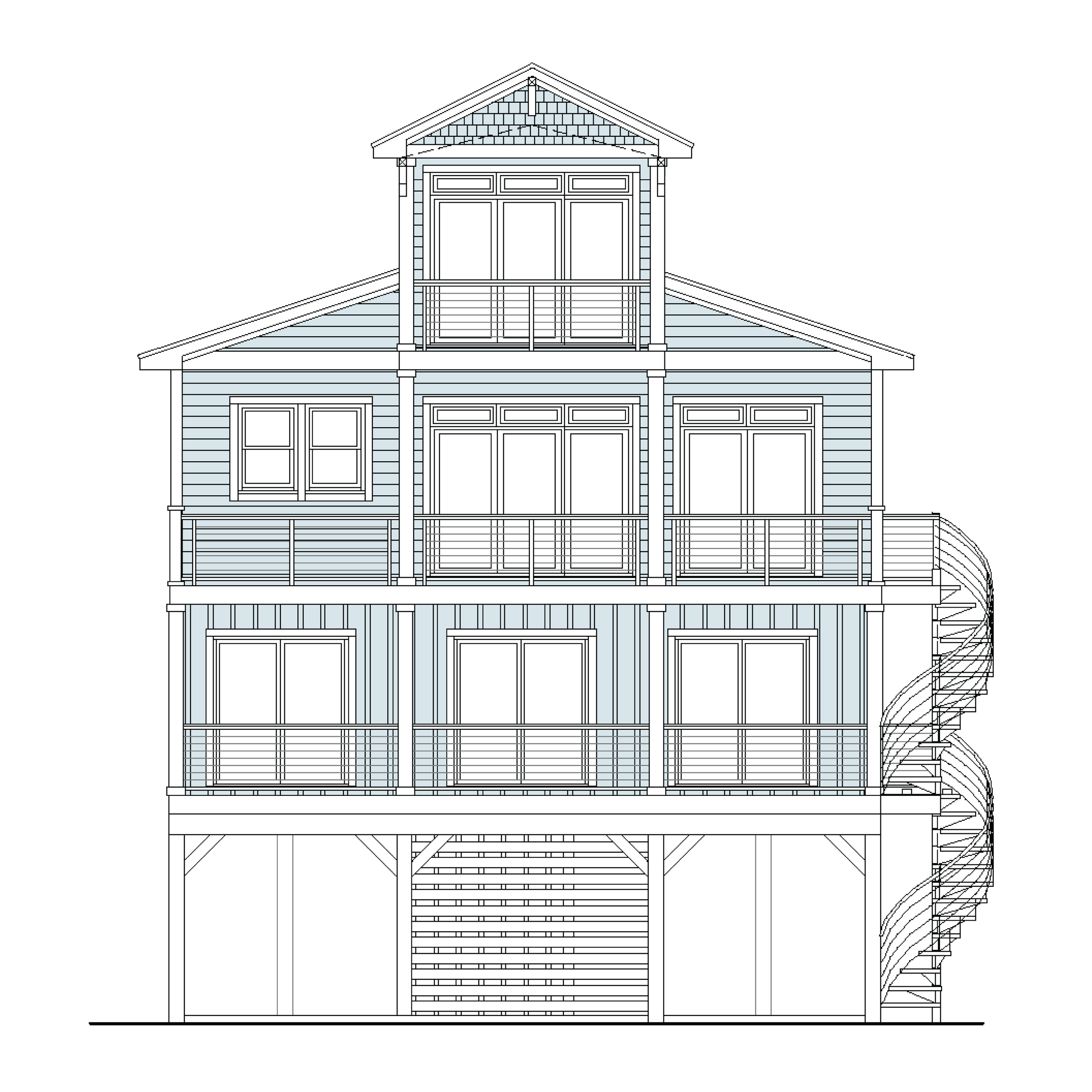 • Architectural drawing of a three-story beach house with blue siding, white trim, balconies on the second and third floors, and a garage at ground level.